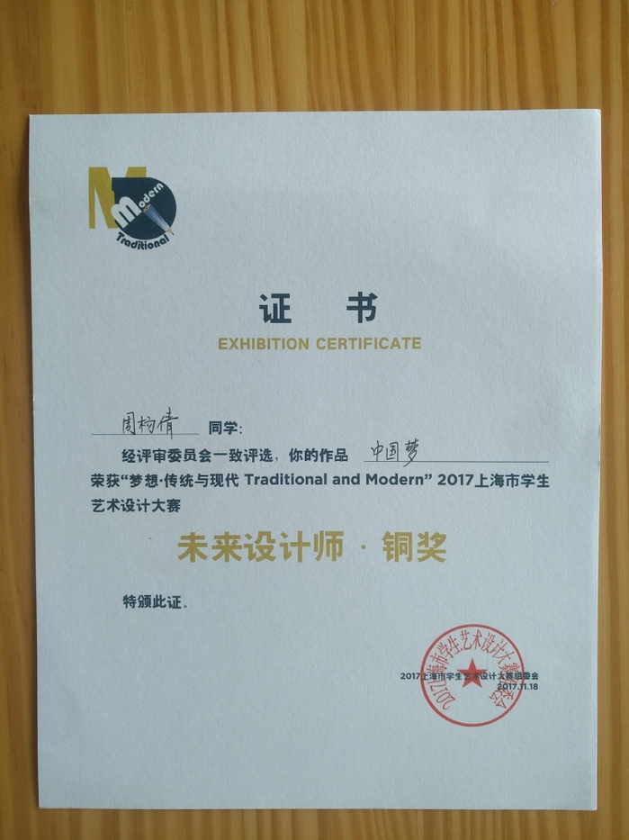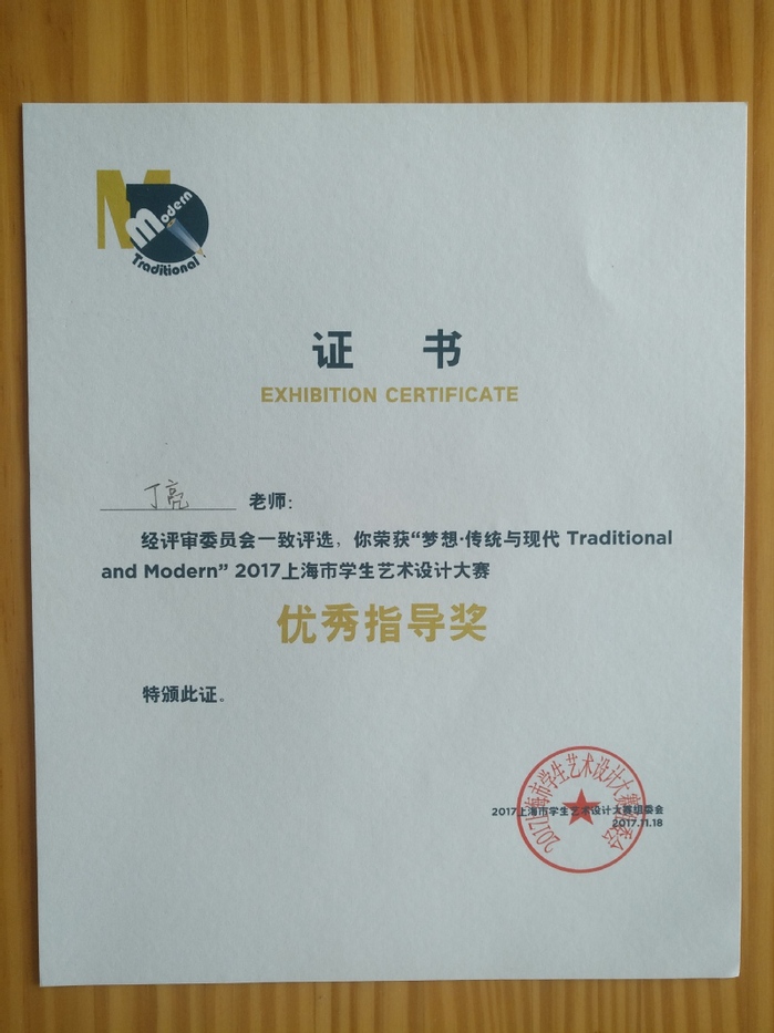 2017年上海市大学生艺术设计大赛是由上海市教委主办的全市高等学校、高职院校、中小学生的艺术设计作品大赛,旨在培养和发掘具有创意开拓精神的未来设计师,传播创意设计理念,为本市学生搭建艺术设计交流平台,通过展评的方式,遴选优秀设计作品和人才并进行推介和奖励,展示上海学校艺术教育的成果。我院丁亮、唐雁老师带领学生积极参与比赛,最终周杨倩同学的艺术作品《中国梦》获得未来设计师称号并获铜奖,魏跃、刘梦吉同学获得优秀参与奖。丁亮老师获得优秀指导奖。