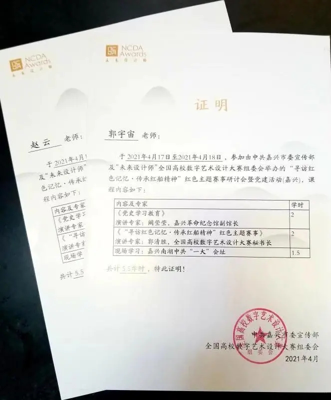2021年4月17日艺术设计系赵云、郭宇宙参加了在嘉兴职业技术学院举办的第九届全国高校数字艺术设计大赛“寻访红色记忆、传承红船精神”红色主题赛事研讨会暨党建活动。